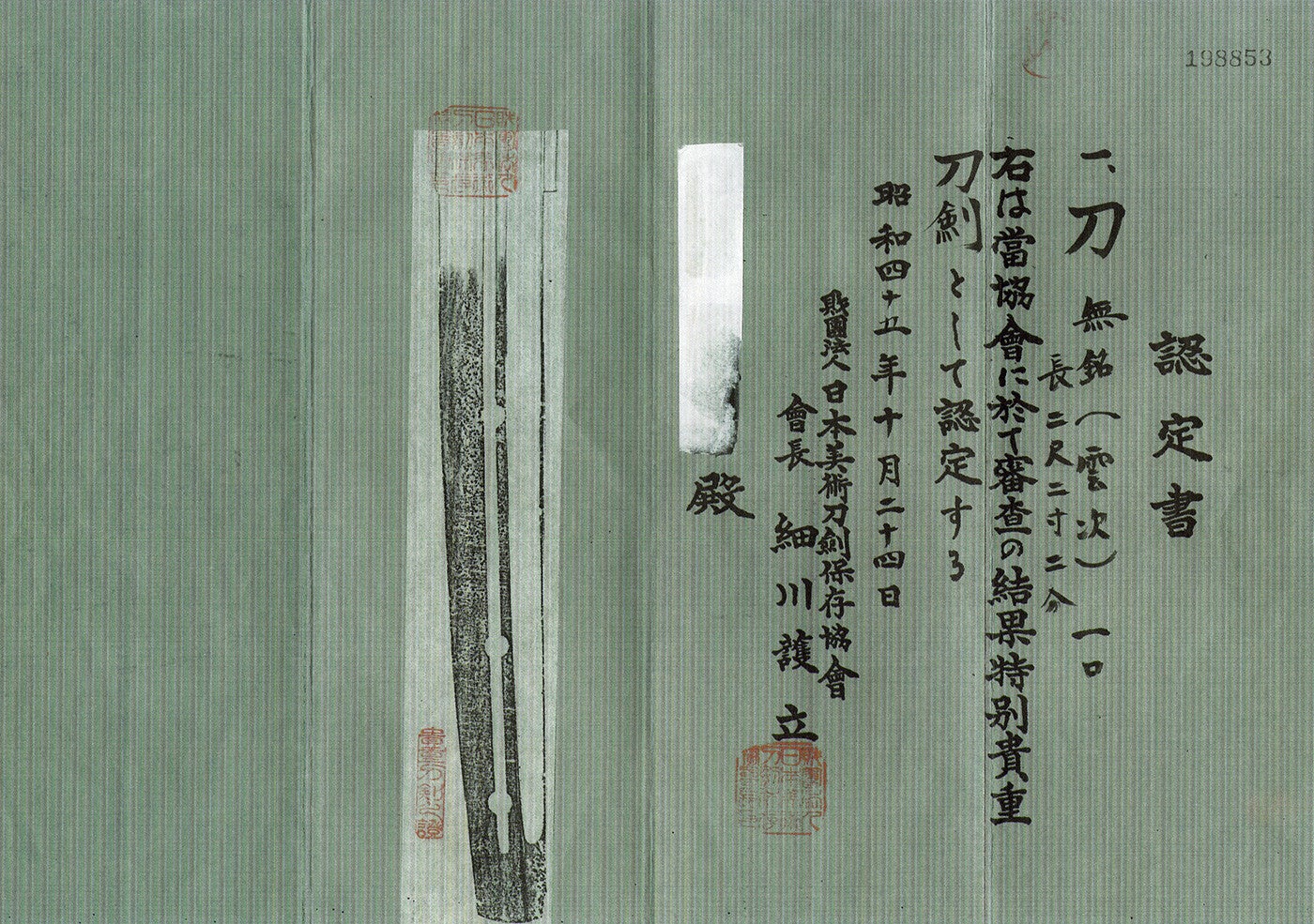 Documentazione allegata: Attestati di Spada Straordinariamente Degna di Conservazione (Tokubetsu Kicho Token e Tokubetsu Hozon Touken) rilasciata dalla Società per la Conservazione della Spada Giapponese (NBTHK)