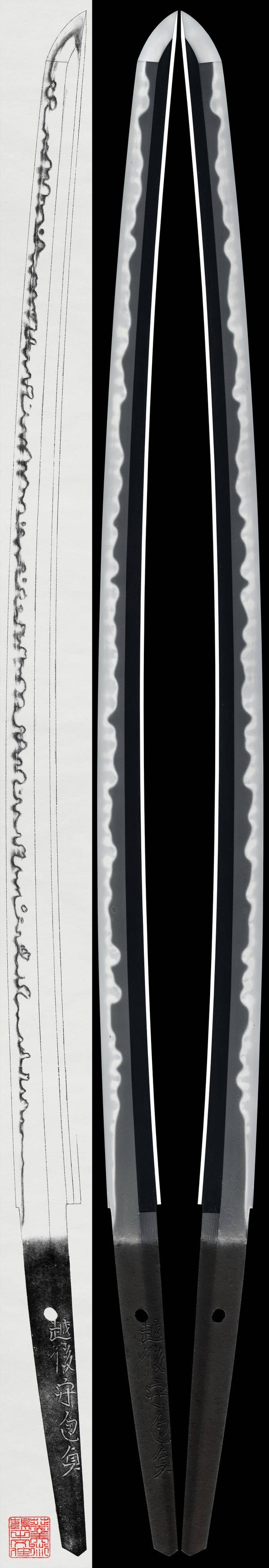 Documentazione allegata: Attestato per Spada Straordinariamente Degna di Conservazione (Tokubetsu Hozon Touken) e 5 attestati (Tokubetsu Kicho Touken) per Koshirae, Tsuba, Menuki, Fuchi-Kashira rilasciati dalla Società per la Conservazione della Spada Giapponese (NBTHK)