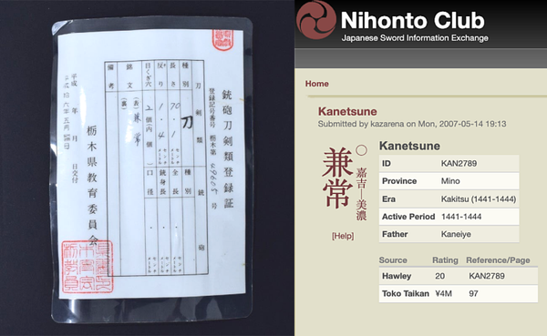 Documentazione allegata: Attestato rilasciato dalla Società per la Conservazione della Spada Giapponese (NBTHK Hozon Tōken)